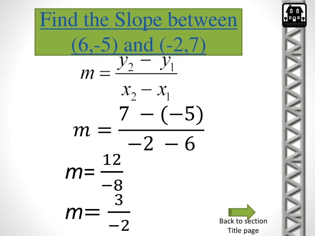 Find the Slope between (6,-5) and (-2,7) m= m Back to section Title page
