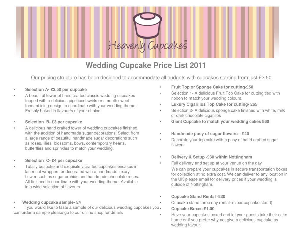 Fruit Top or Sponge Cake for cutting-£50 • Selection 1- A delicious Fruit Top Cake for cutting tied with ribbon to match your wedding colours. • Luxury Cigarillos Top Cake for cutting- £65 • Selection 2- A delicious sponge cake finished with white, milk or dark chocolate cigarillos • Giant Cupcake to match your wedding cakes £60 • Handmade posy of sugar flowers – £40 • Decorate your top cake with a posy of hand crafted sugar flowers • Delivery & Setup -£30 within Nottingham • Full delivery and set up at your venue on the day We can prepare your cupcakes in secure transportation boxes for collection at no extra cost. We can deliver to any location in the UK please email for delivery prices if your wedding is outside of Nottingham. • Cupcake Stand Rental -£30 • Cupcake stand three day rental- (clear cupcake stand) • Cupcake Boxes-£1.00 • Have your cupcakes boxed and let your guests take their cake home or if you prefer why not give a delicious cupcake as wedding favour. • Selection A- £2.50 per cupcake • A beautiful tower of hand crafted classic wedding cupcakes topped with a delicious pipe iced swirls or smooth sweet fondant icing design to coordinate with your wedding theme. Freshly baked in flavour/s of your choice. • Selection B- £3 per cupcake • A delicious hand crafted tower of wedding cupcakes finished with the addition of handmade sugar decorations. Select from a large range of beautiful handmade sugar decorations such as roses, lilies, blossoms, bows, contemporary hearts, butterflies and sprinkles to match your wedding. • Selection C- £4 per cupcake • Totally bespoke and exquisitely crafted cupcakes encases in laser cut wrappers or decorated with a handmade luxury flower such as sugar orchids and handmade chocolate roses. All finished to coordinate with your wedding theme. Available in a wide selection of flavours. Wedding Cupcake Price List 2011 Our pricing structure has been designed to accommodate all budgets with cupcakes starting from just £2.50 • Wedding cupcake sample- £4 • If you would like to taste a sample of our delicious wedding cupcakes you can order a sample please go to our online shop for details