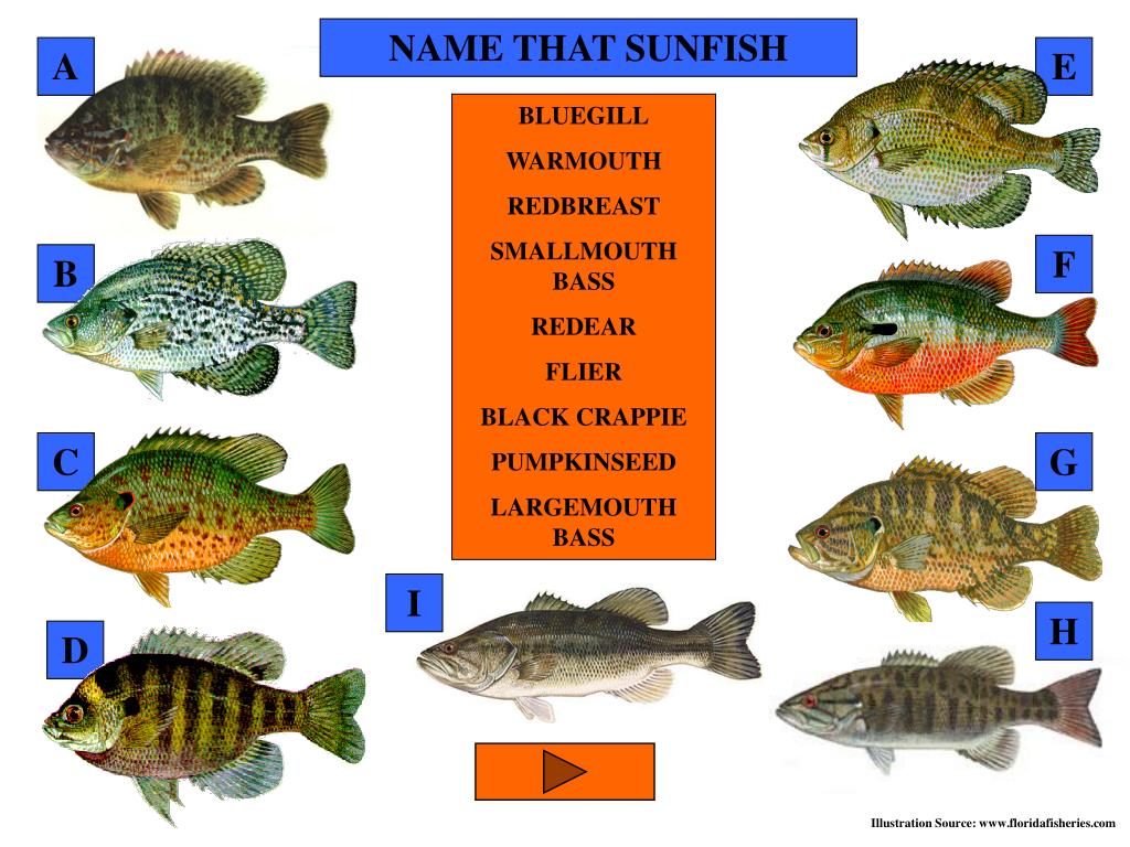 NAME THAT SUNFISH A E BLUEGILL WARMOUTH REDBREAST SMALLMOUTH BASS REDEAR FLIER BLACK CRAPPIE PUMPKINSEED LARGEMOUTH BASS F B C G I H D Illustration Source: www.floridafisheries.com