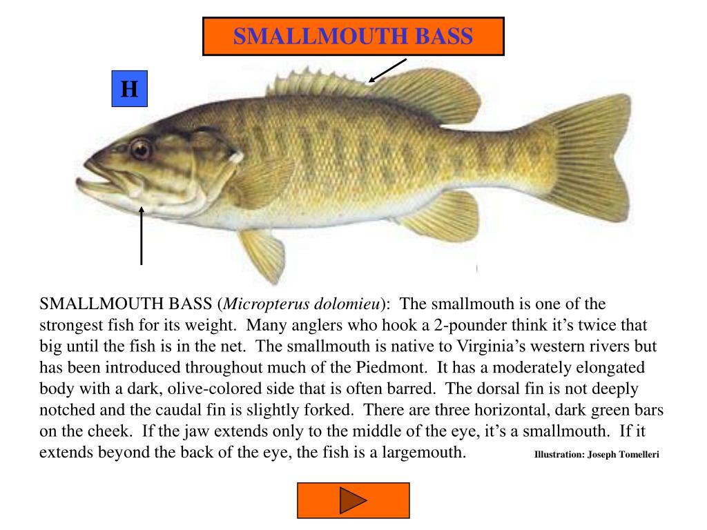SMALLMOUTH BASS H SMALLMOUTH BASS (Micropterus dolomieu): The smallmouth is one of the strongest fish for its weight. Many anglers who hook a 2-pounder think it’s twice that big until the fish is in the net. The smallmouth is native to Virginia’s western rivers but has been introduced throughout much of the Piedmont. It has a moderately elongated body with a dark, olive-colored side that is often barred. The dorsal fin is not deeply notched and the caudal fin is slightly forked. There are three horizontal, dark green bars on the cheek. If the jaw extends only to the middle of the eye, it’s a smallmouth. If it extends beyond the back of the eye, the fish is a largemouth.Illustration: Joseph Tomelleri