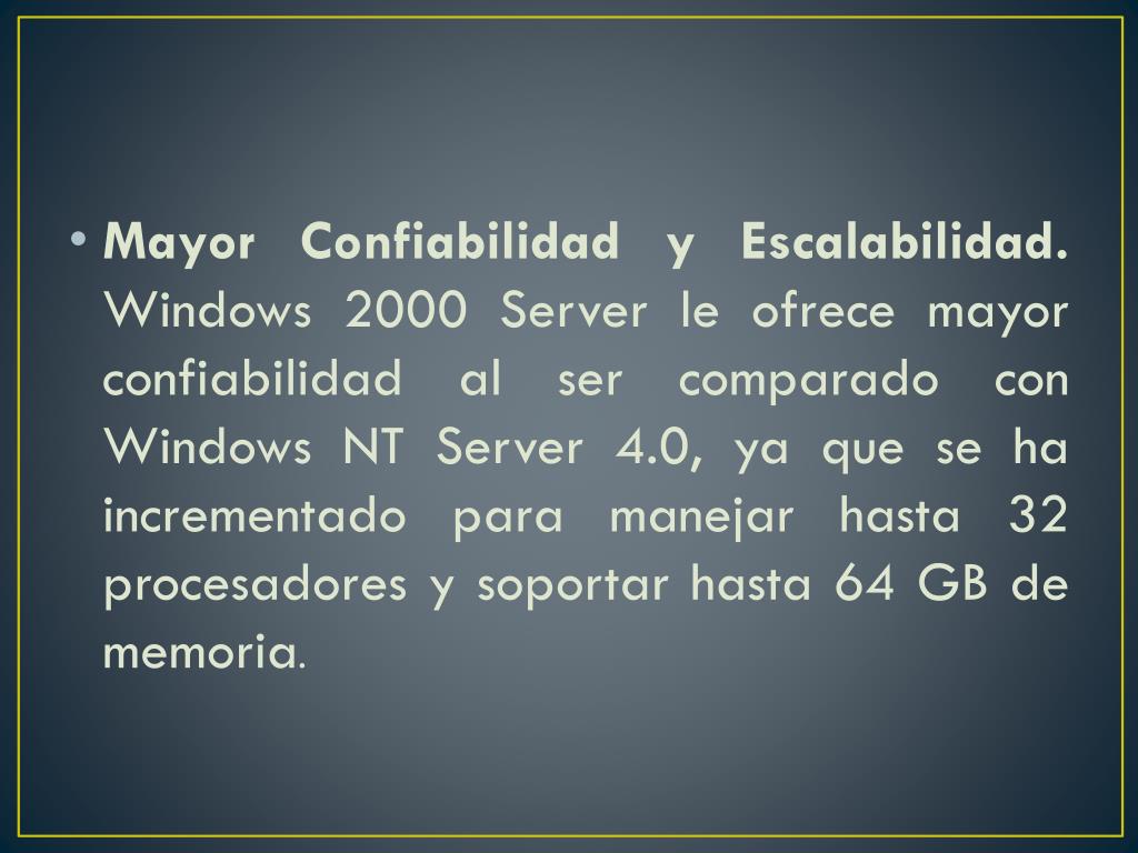 Mayor Confiabilidad y Escalabilidad. Windows 2000 Server le ofrece mayor confiabilidad al ser comparado con Windows NT Server 4.0, ya que se ha incrementado para manejar hasta 32 procesadores y soportar hasta 64 GB de memoria.
