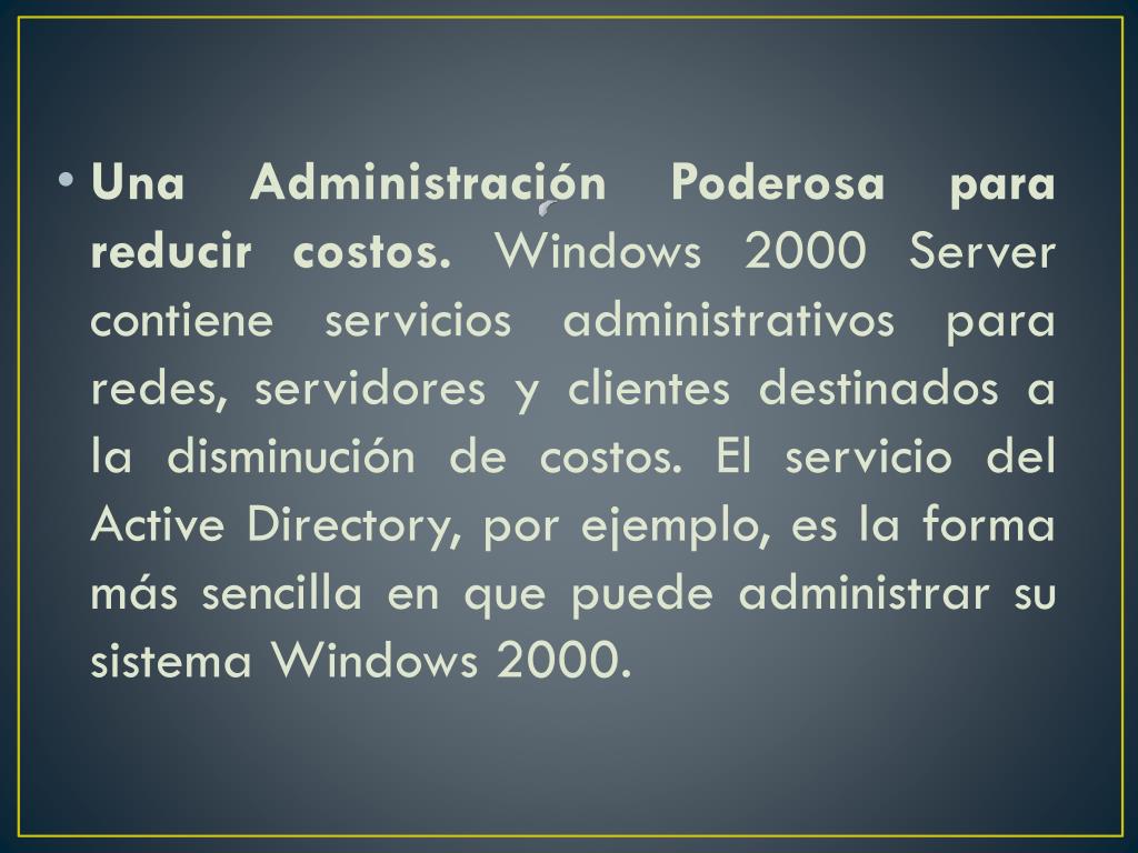 Una Administración Poderosa para reducir costos. Windows 2000 Server contiene servicios administrativos para redes, servidores y clientes destinados a la disminución de costos. El servicio del Active Directory, por ejemplo, es la forma más sencilla en que puede administrar su sistema Windows 2000.