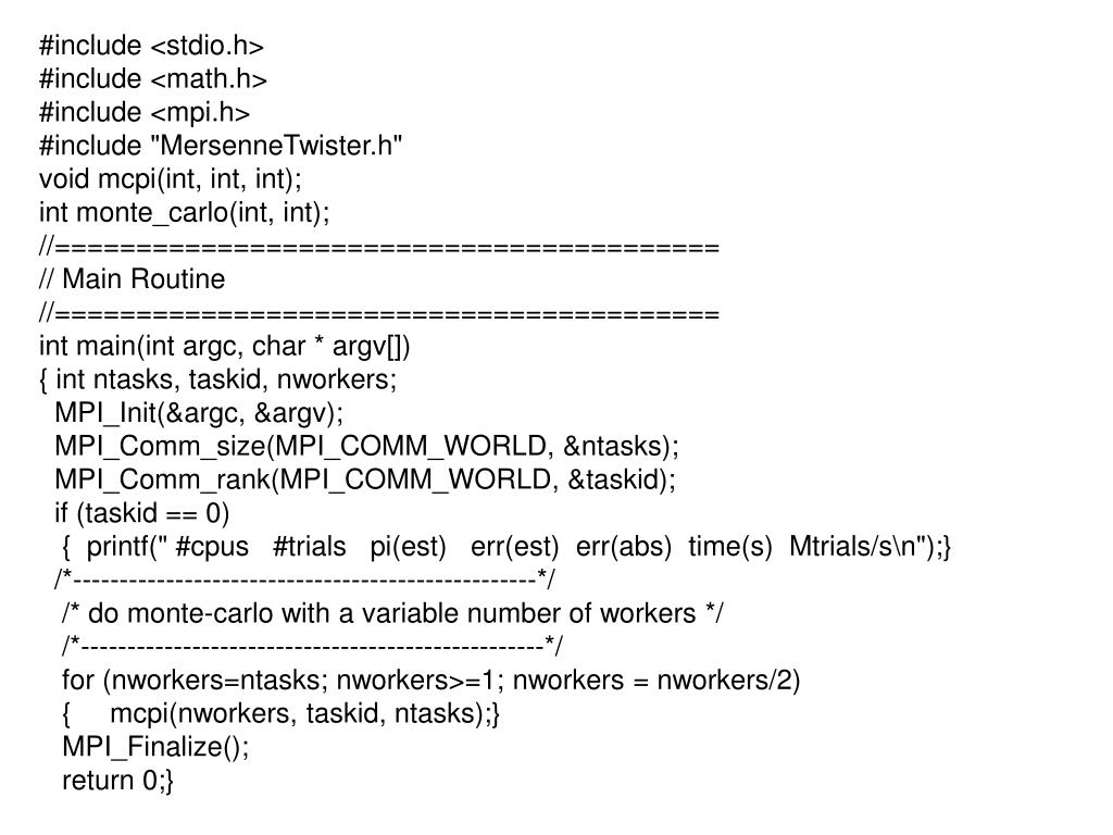 #include <stdio.h>#include <math.h>#include <mpi.h>#include "MersenneTwister.h"void mcpi(int, int, int);int monte_carlo(int, int);//=========================================// Main Routine//=========================================int main(int argc, char * argv[]){ int ntasks, taskid, nworkers; MPI_Init(&argc, &argv); MPI_Comm_size(MPI_COMM_WORLD, &ntasks); MPI_Comm_rank(MPI_COMM_WORLD, &taskid); if (taskid == 0) { printf(" #cpus #trials pi(est) err(est) err(abs) time(s) Mtrials/s\n");} /*--------------------------------------------------*/ /* do monte-carlo with a variable number of workers */ /*--------------------------------------------------*/ for (nworkers=ntasks; nworkers>=1; nworkers = nworkers/2) { mcpi(nworkers, taskid, ntasks);} MPI_Finalize(); return 0;}