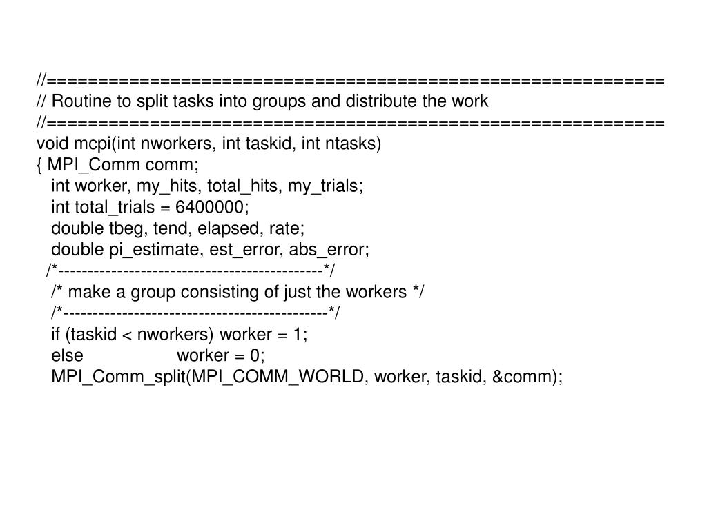 //============================================================// Routine to split tasks into groups and distribute the work//============================================================void mcpi(int nworkers, int taskid, int ntasks){ MPI_Comm comm; int worker, my_hits, total_hits, my_trials; int total_trials = 6400000; double tbeg, tend, elapsed, rate; double pi_estimate, est_error, abs_error; /*---------------------------------------------*/ /* make a group consisting of just the workers */ /*---------------------------------------------*/ if (taskid < nworkers) worker = 1; else worker = 0; MPI_Comm_split(MPI_COMM_WORLD, worker, taskid, &comm);