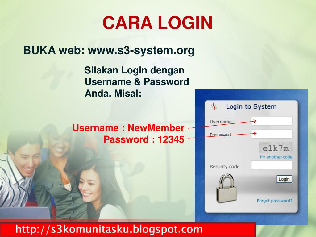 CARA LOGIN BUKA web: www.s3-system.org Silakan Login dengan Username & Password Anda. Misal: Username : NewMember Password : 12345 http://s3komunitasku.blogspot.com