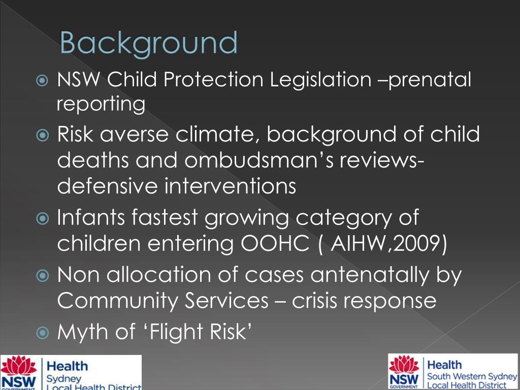 Background • NSW Child Protection Legislation –prenatal reporting • Risk averse climate, background of child deaths and ombudsman’s reviews- defensive interventions • Infants fastest growing category of children entering OOHC ( AIHW,2009) • Non allocation of cases antenatally by Community Services – crisis response • Myth of ‘Flight Risk’