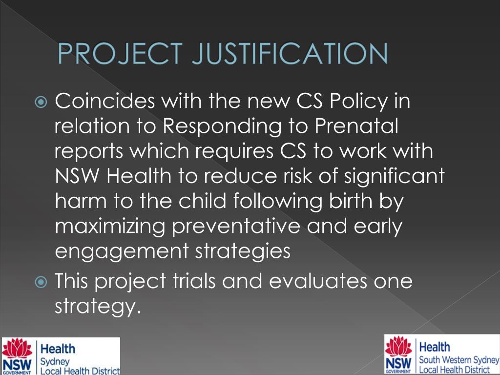 PROJECT JUSTIFICATION • Coincides with the new CS Policy in relation to Responding to Prenatal reports which requires CS to work with NSW Health to reduce risk of significant harm to the child following birth by maximizing preventative and early engagement strategies • This project trials and evaluates one strategy.