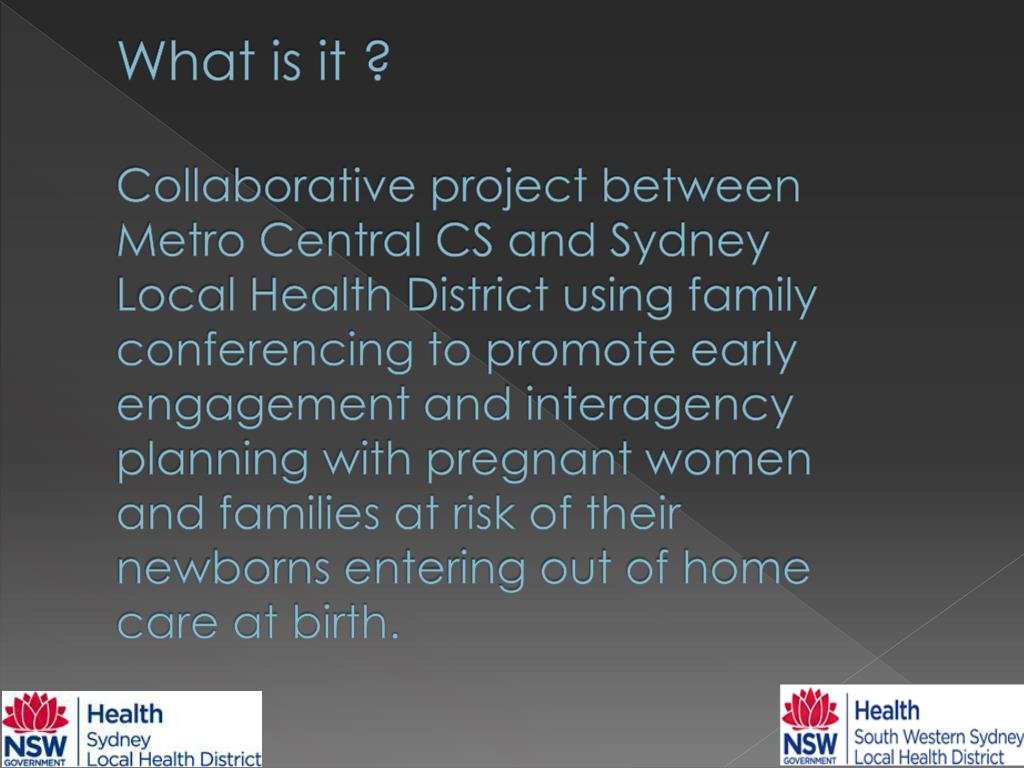 What is it ? Collaborative project between Metro Central CS and Sydney Local Health District using family conferencing to promote early engagement and interagency planning with pregnant women and families at risk of their newborns entering out of home care at birth.