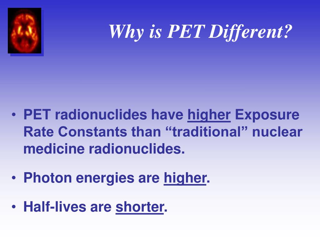 Why is PET Different? • PET radionuclides have higher Exposure Rate Constants than “traditional” nuclear medicine radionuclides. • Photon energies are higher. • Half-lives are shorter.