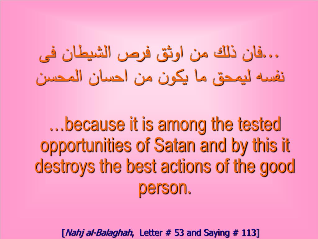 ...فان ذلك من اوثق فرص الشيطان فى نفسه ليمحق ما يكون من احسان المحسن …because it is among the tested opportunities of Satan and by this it destroys the best actions of the good person. [Nahj al-Balaghah, Letter # 53 and Saying # 113]