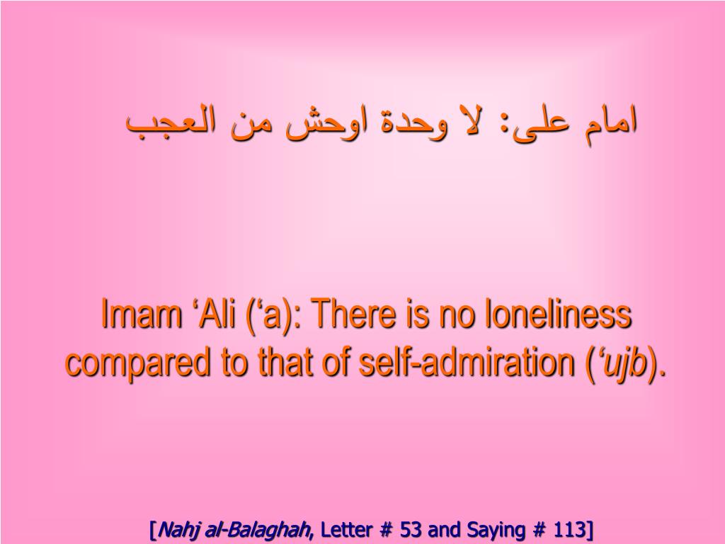 امام على: لا وحدة اوحش من العجب Imam ‘Ali (‘a): There is no loneliness compared to that of self-admiration (‘ujb). [Nahj al-Balaghah, Letter # 53 and Saying # 113]