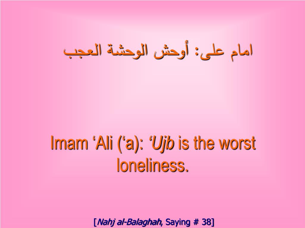 امام على: أوحش الوحشة العجب Imam ‘Ali (‘a): ‘Ujb is the worst loneliness. [Nahj al-Balaghah, Saying # 38]