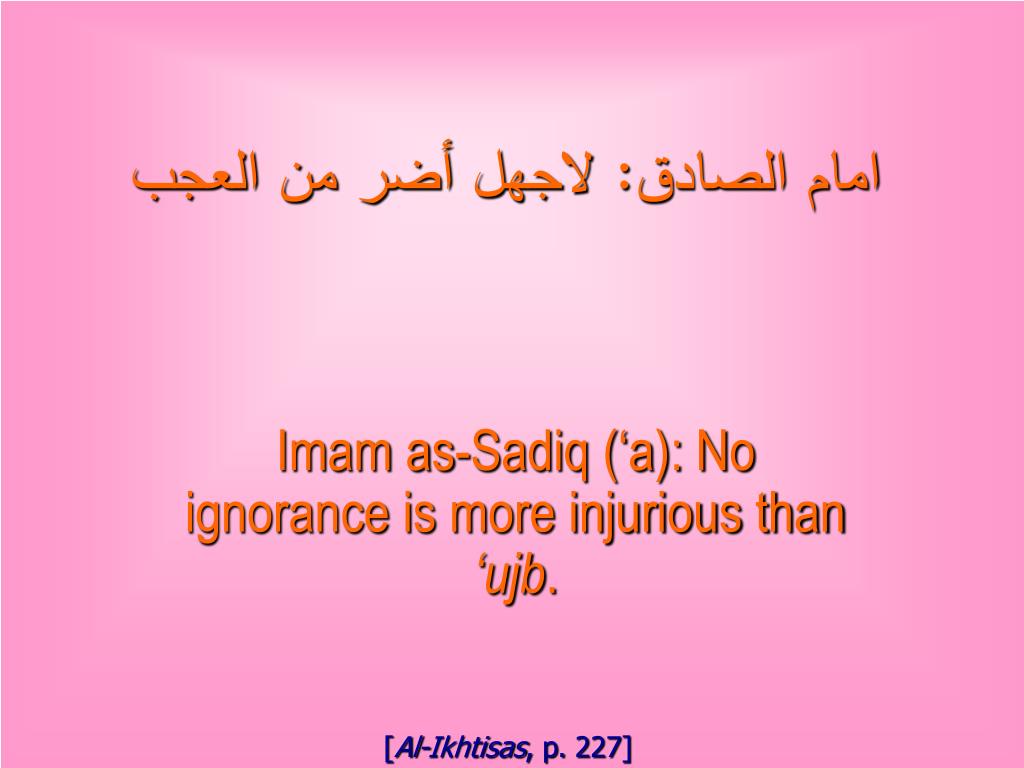 امام الصادق: لاجهل أضر من العجب Imam as-Sadiq (‘a): No ignorance is more injurious than ‘ujb. [Al-Ikhtisas, p. 227]