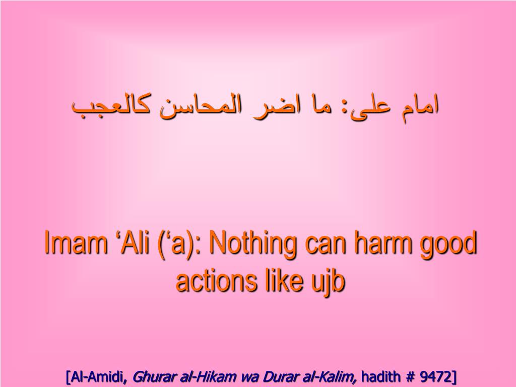 امام على: ما اضر المحاسن كالعجب Imam ‘Ali (‘a): Nothing can harm good actions like ujb [Al-Amidi, Ghurar al-Hikam wa Durar al-Kalim, hadith # 9472]