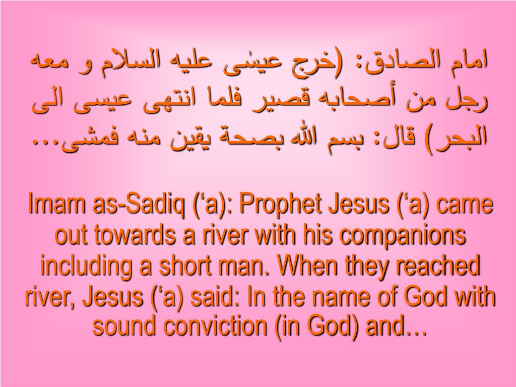 امام الصادق: (خرج عيسٰى عليه السلام و معه رجل من أصحابه قصير فلما انتهى عيسى الى البحر) قال: بسم الله بصحة يقين منه فمشى... Imam as-Sadiq (‘a): Prophet Jesus (‘a) came out towards a river with his companions including a short man. When they reached river, Jesus (‘a) said: In the name of God with sound conviction (in God) and…