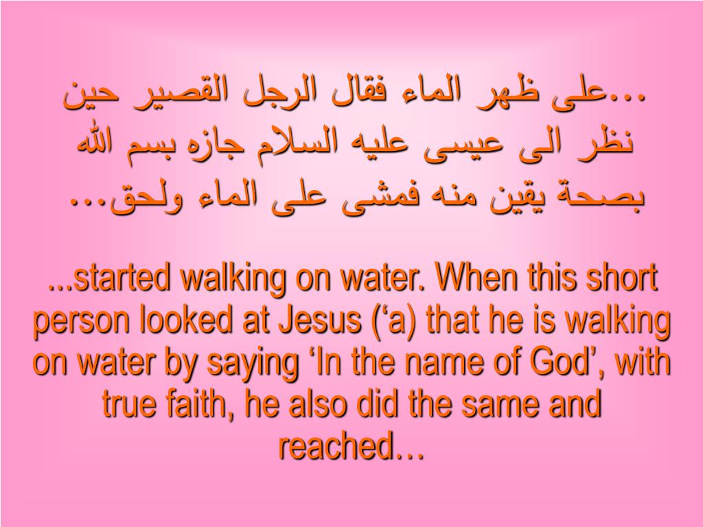 ...على ظهر الماء فقال الرجل القصير حين نظر الى عيسى عليه السلام جازه بسم الله بصحة يقين منه فمشى على الماء ولحق... ...started walking on water. When this short person looked at Jesus (‘a) that he is walking on water by saying ‘In the name of God’, with true faith, he also did the same and reached…