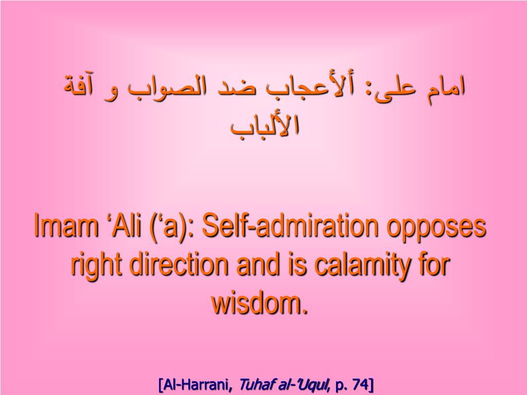 امام على: ألأعجاب ضد الصواب و ﺁفة الألباب Imam ‘Ali (‘a): Self-admiration opposes right direction and is calamity for wisdom. [Al-Harrani, Tuhaf al-’Uqul, p. 74]