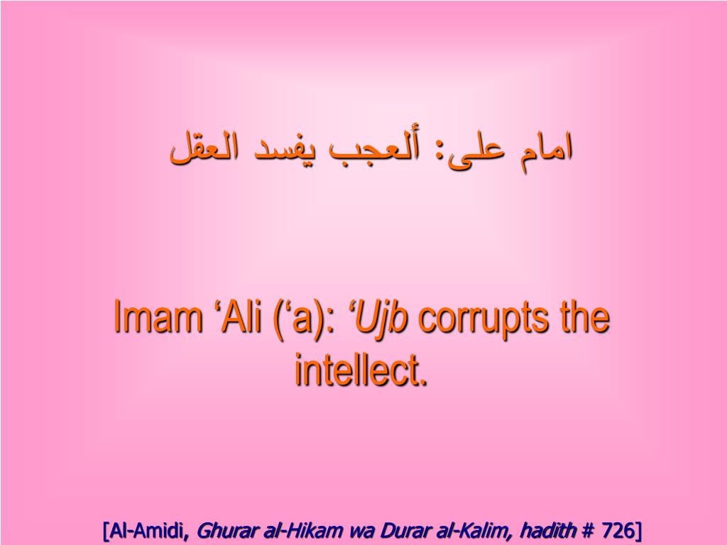 امام على: ألعجب يفسد العقل Imam ‘Ali (‘a): ‘Ujb corrupts the intellect. [Al-Amidi, Ghurar al-Hikam wa Durar al-Kalim, hadith # 726]