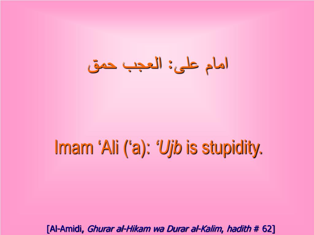 امام على: العجب رأس الحماقة Imam ‘Ali (‘a): ‘Ujb is the fountainhead of stupidity. [Al-Amidi, Ghurar al-Hikam wa Durar al-Kalim, hadith # 738]