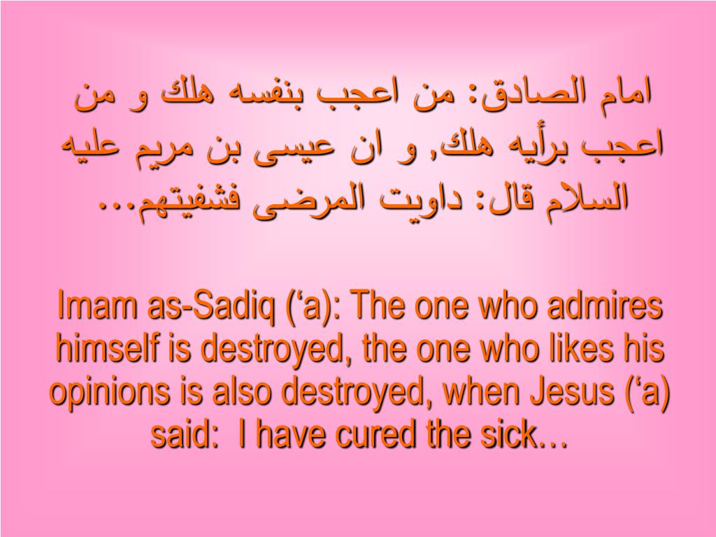 امام الصادق: من اعجب بنفسه هلك و من اعجب برأيه هلك, و ان عيسى بن مريم عليه السلام قال: داويت المرضى فشفيتهم... Imam as-Sadiq (‘a): The one who admires himself is destroyed, the one who likes his opinions is also destroyed, when Jesus (‘a) said: I have cured the sick…