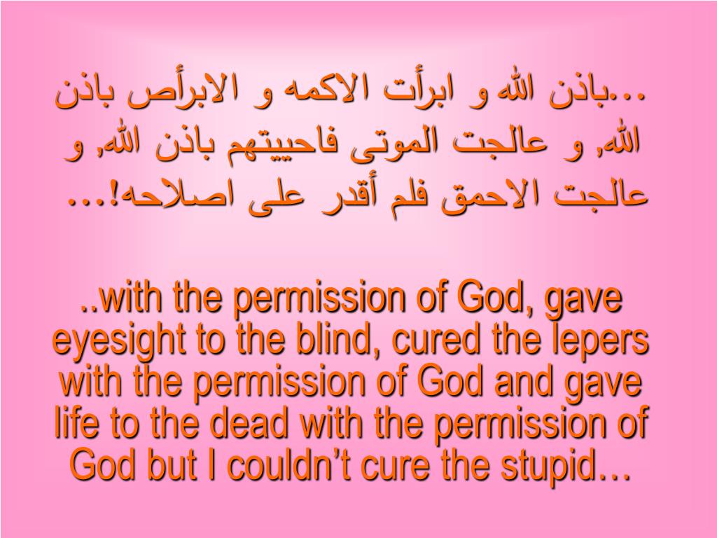 ...باذن الله و ابرأت الاكمه و الابرأص باذن الله, و عالجت الموتى فاحييتهم باذن الله, و عالجت الاحمق فلم أقدر على اصلاحه!... ..with the permission of God, gave eyesight to the blind, cured the lepers with the permission of God and gave life to the dead with the permission of God but I couldn’t cure the stupid…