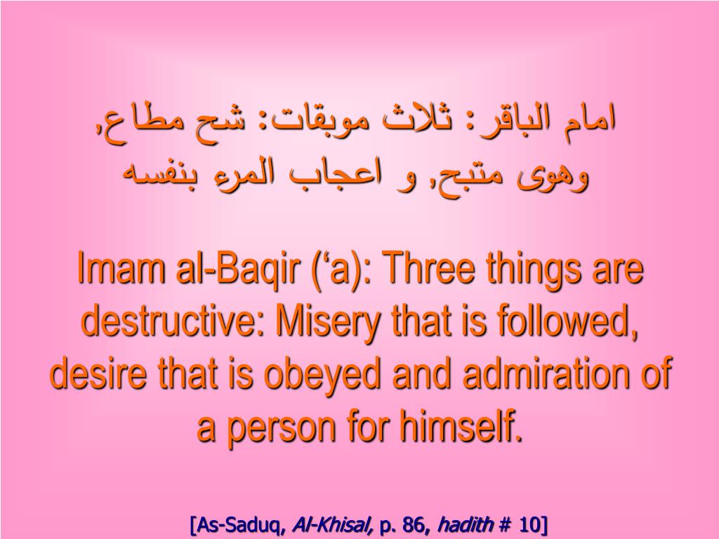 امام الباقر: ثلاث موبقات: شح مطاع, وهوى متبح, و اعجاب المرء بنفسه Imam al-Baqir (‘a): Three things are destructive: Misery that is followed, desire that is obeyed and admiration of a person for himself. [As-Saduq, Al-Khisal, p. 86, hadith # 10]