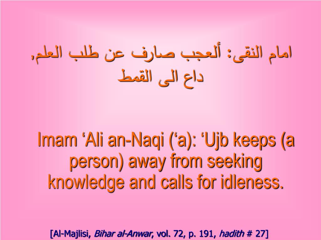 امام النقى: ألعجب صارف عن طلب العلم, داع الى القمط Imam ‘Ali an-Naqi (‘a): ‘Ujb keeps (a person) away from seeking knowledge and calls for idleness. [Al-Majlisi, Bihar al-Anwar, vol. 72, p. 191, hadith # 27]