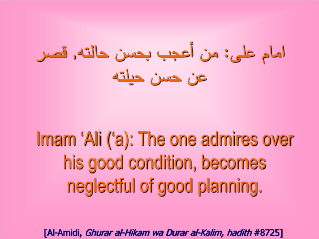 امام على: من أعجب بحسن حالته, قصر عن حسن حيلته Imam ‘Ali (‘a): The one admires over his good condition, becomes neglectful of good planning. [Al-Amidi, Ghurar al-Hikam wa Durar al-Kalim, hadith #8725]