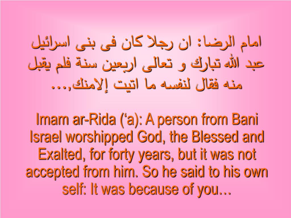 امام الرضا: ان رجلا كان فى بنى اسرائيل عبد الله تبارك و تعالى اربعين سنة فلم يقبل منه فقال لنفسه ما اتيت إلامنك,... Imam ar-Rida (‘a): A person from Bani Israel worshipped God, the Blessed and Exalted, for forty years, but it was not accepted from him. So he said to his own self: It was because of you…