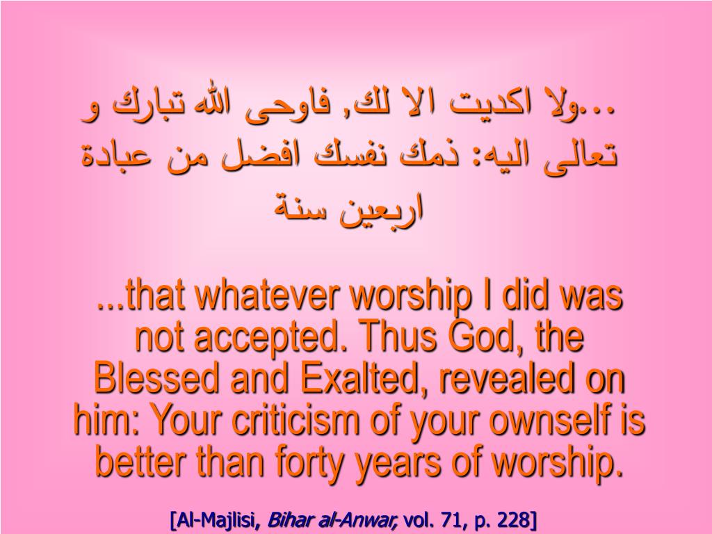 ...ولا اكديت الا لك, فاوحى الله تبارك و تعالى اليه: ذمك نفسك افضل من عبادة اربعين سنة ...that whatever worship I did was not accepted. Thus God, the Blessed and Exalted, revealed on him: Your criticism of your ownself is better than forty years of worship. [Al-Majlisi, Bihar al-Anwar, vol. 71, p. 228]