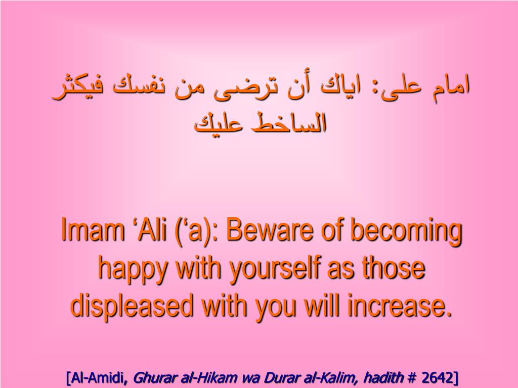 امام على: اياك أن ترضى من نفسك فيكثر الساخط عليك Imam ‘Ali (‘a): Beware of becoming happy with yourself as those displeased with you will increase. [Al-Amidi, Ghurar al-Hikam wa Durar al-Kalim, hadith # 2642]