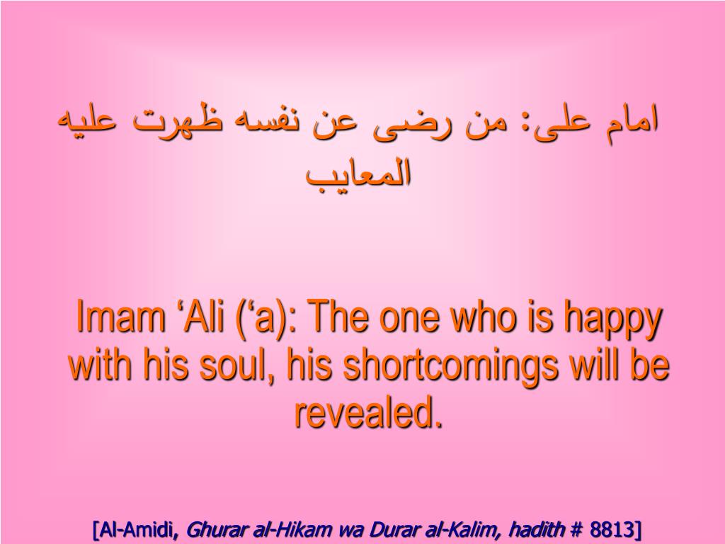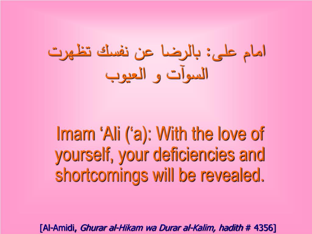 امام على: بالرضا عن نفسك تظهرت السوآت و العيوب Imam ‘Ali (‘a): With the love of yourself, your deficiencies and shortcomings will be revealed. [Al-Amidi, Ghurar al-Hikam wa Durar al-Kalim, hadith # 4356]