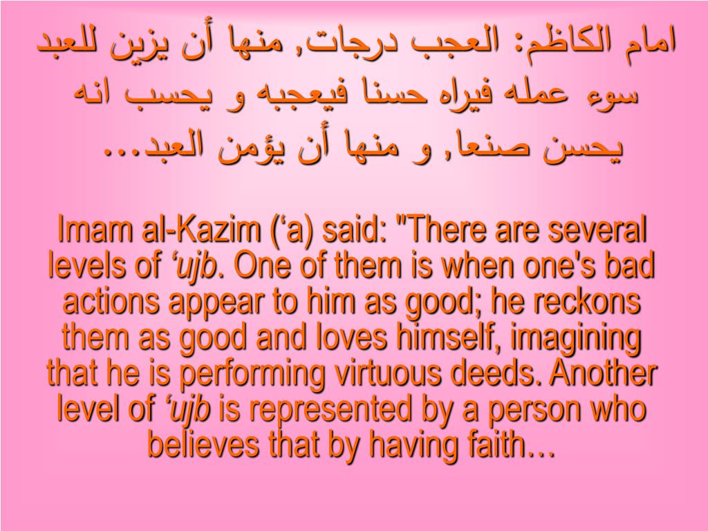 امام الكاظم: العجب درجات, منها أن يزين للعبد سوء عمله فيراه حسنا فيعجبه و يحسب انه يحسن صنعا, و منها أن يؤمن العبد... Imam al-Kazim (‘a) said: "There are several levels of ‘ujb. One of them is when one's bad actions appear to him as good; he reckons them as good and loves himself, imagining that he is performing virtuous deeds. Another level of ‘ujb is represented by a person who believes that by having faith…