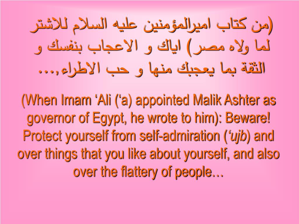 (من كتاب اميرالمؤمنين عليه السلام للاشتر لما ولاه مصر) اياك و الاعجاب بنفسك و الثقة بما يعجبك منها و حب الاطراء,... (When Imam ‘Ali (‘a) appointed Malik Ashter as governor of Egypt, he wrote to him): Beware! Protect yourself from self-admiration (‘ujb) and over things that you like about yourself, and also over the flattery of people…