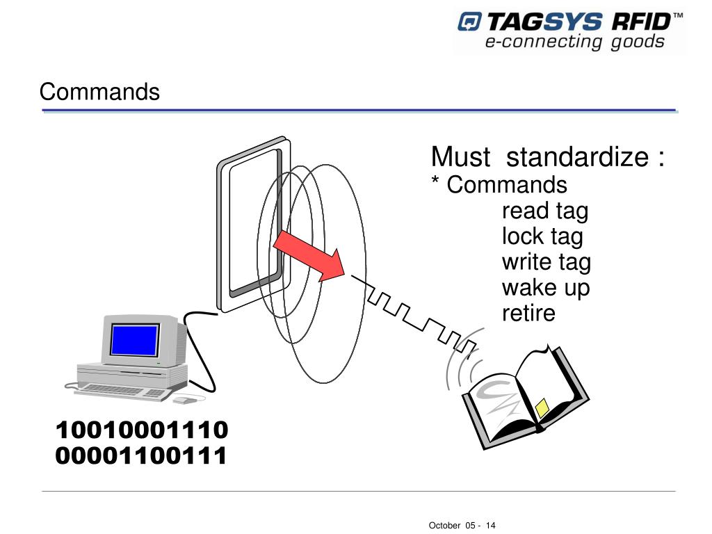 Commands Must standardize : * Commands read tag lock tag write tag wake up retire 10010001110 00001100111