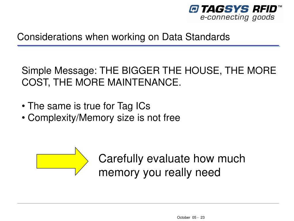 Considerations when working on Data Standards • Simple Message: THE BIGGER THE HOUSE, THE MORE COST, THE MORE MAINTENANCE. • The same is true for Tag ICs • Complexity/Memory size is not free • Carefully evaluate how much memory you really need
