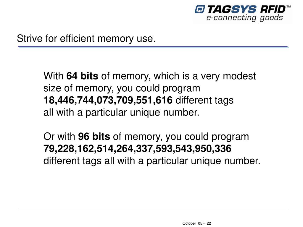 Strive for efficient memory use. With 64 bits of memory, which is a very modest size of memory, you could program 18,446,744,073,709,551,616 different tags all with a particular unique number. Or with 96 bits of memory, you could program 79,228,162,514,264,337,593,543,950,336 different tags all with a particular unique number.