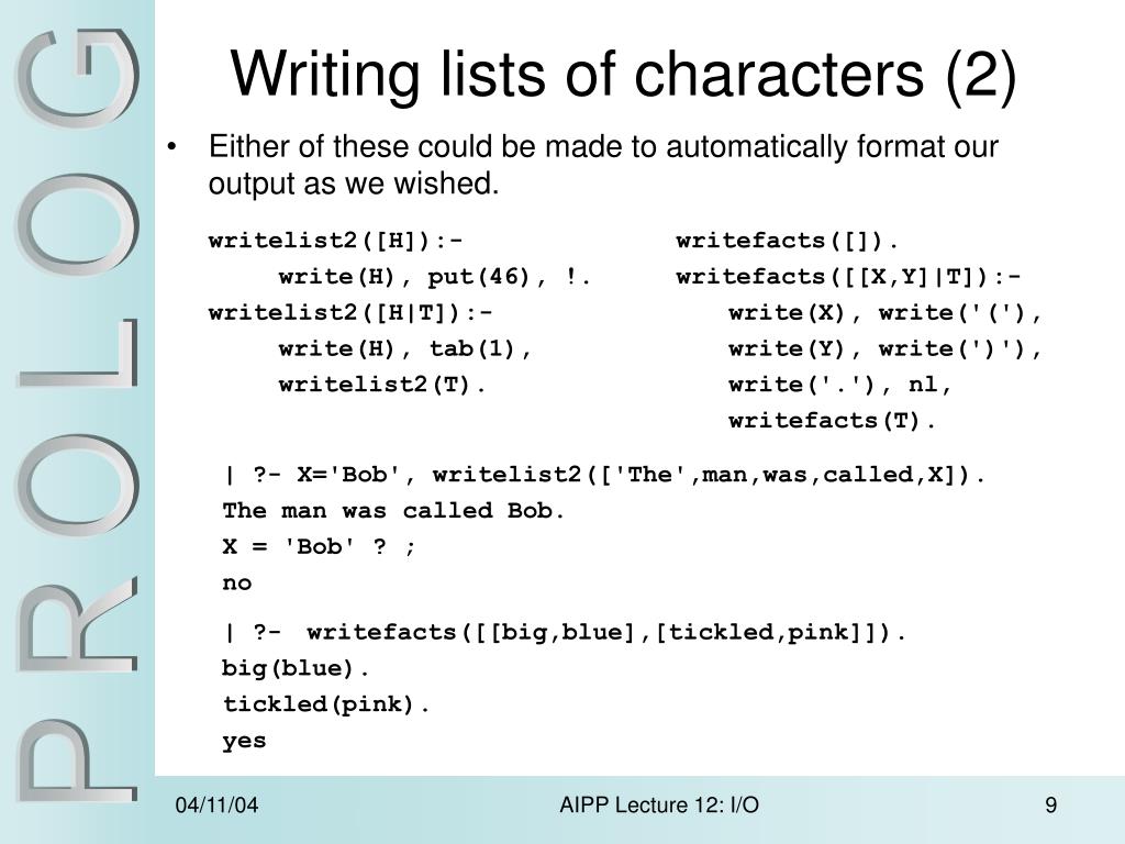 Writing lists of characters (2) • Either of these could be made to automatically format our output as we wished. writelist2([H]):- writefacts([]). write(H), put(46), !. writefacts([[X,Y]|T]):- writelist2([H|T]):- write(X), write('('), write(H), tab(1), write(Y), write(')'), writelist2(T). write('.'), nl, writefacts(T). | ?- X='Bob', writelist2(['The',man,was,called,X]). The man was called Bob. X = 'Bob' ? ; no | ?- writefacts([[big,blue],[tickled,pink]]). big(blue). tickled(pink). yes AIPP Lecture 12: I/O