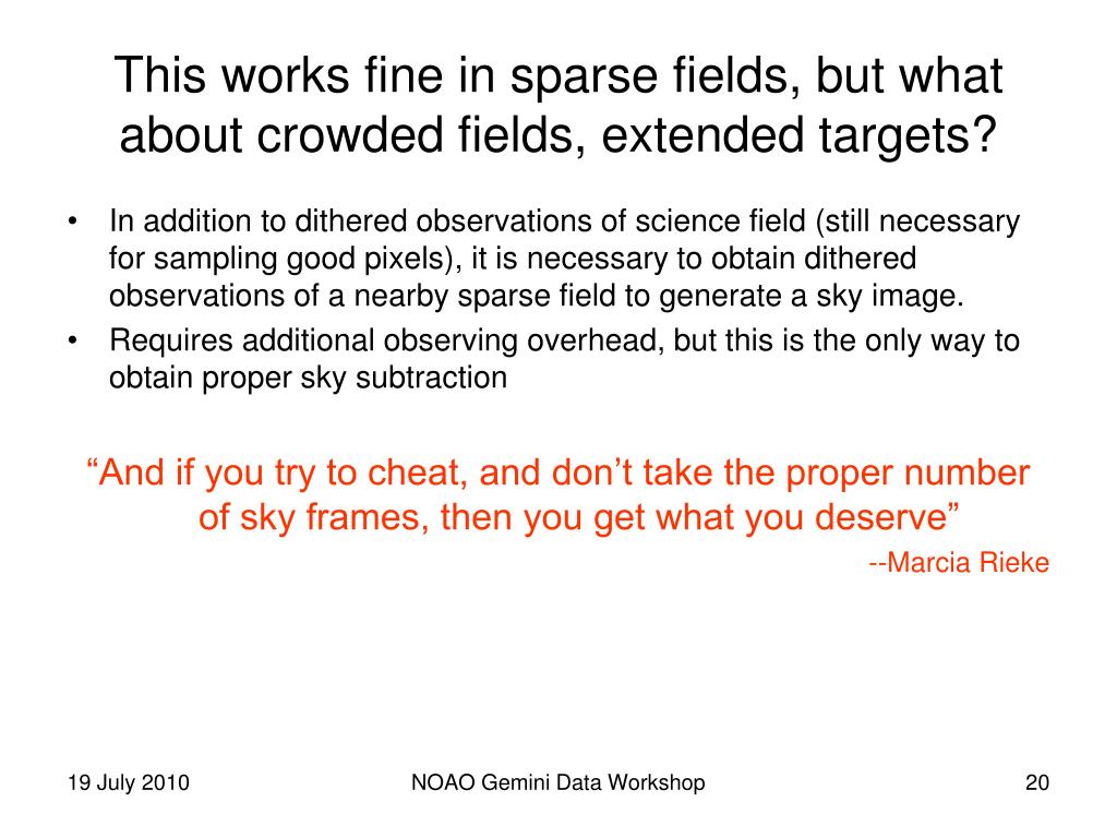 This works fine in sparse fields, but what about crowded fields, extended targets? • In addition to dithered observations of science field (still necessary for sampling good pixels), it is necessary to obtain dithered observations of a nearby sparse field to generate a sky image. • Requires additional observing overhead, but this is the only way to obtain proper sky subtraction “And if you try to cheat, and don’t take the proper number of sky frames, then you get what you deserve” --Marcia Rieke NOAO Gemini Data Workshop
