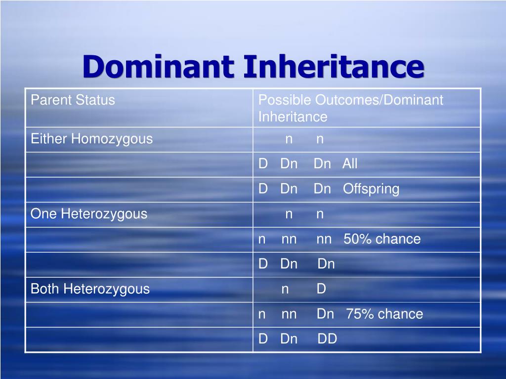 Recessive Inheritance Parent Status Possible Outcomes n n n nn nn d dn dn One Heterozygous 50% Carrier 0 Expression d n n dn nn d dd dn 50% Carrier 25% Expression Both Heterozygous One Homozygous One Free n n d dn dn d dn dn 100% Carrier