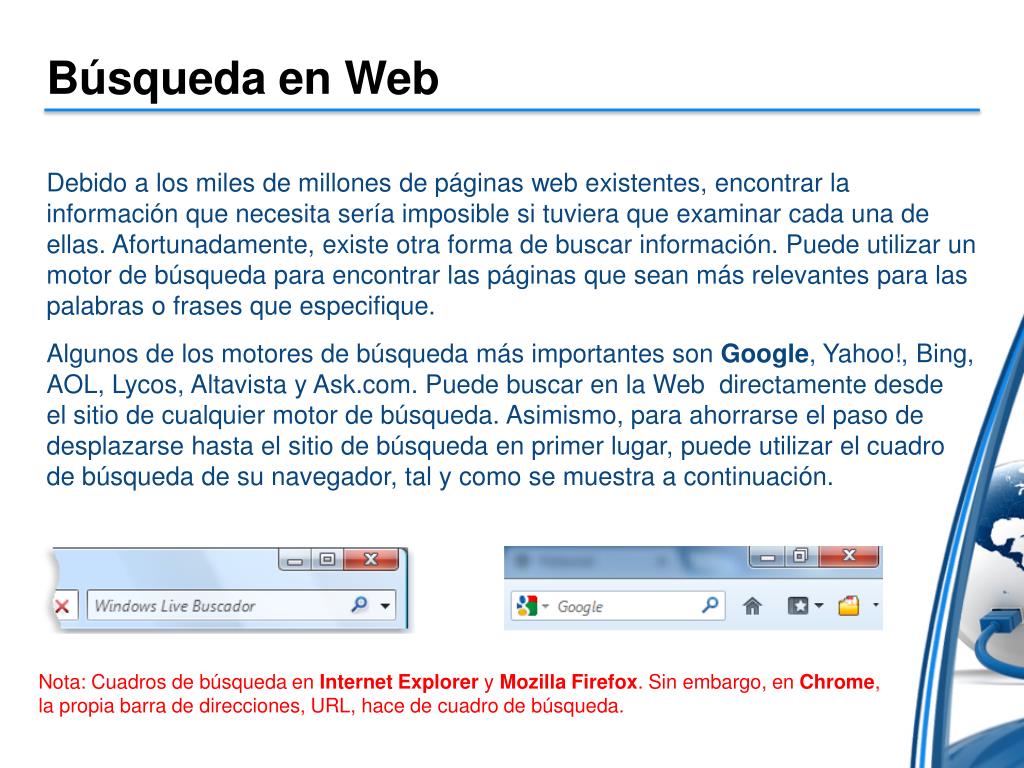 Búsqueda en Web Debido a los miles de millones de páginas web existentes, encontrar la información que necesita sería imposible si tuviera que examinar cada una de ellas. Afortunadamente, existe otra forma de buscar información. Puede utilizar un motor de búsqueda para encontrar las páginas que sean más relevantes para las palabras o frases que especifique. Algunos de los motores de búsqueda más importantes son Google, Yahoo!, Bing, AOL, Lycos, Altavista y Ask.com. Puede buscar en la Web directamente desde el sitio de cualquier motor de búsqueda. Asimismo, para ahorrarse el paso de desplazarse hasta el sitio de búsqueda en primer lugar, puede utilizar el cuadro de búsqueda de su navegador, tal y como se muestra a continuación. Nota: Cuadros de búsqueda en Internet Explorer y MozillaFirefox. Sin embargo, en Chrome, la propia barra de direcciones, URL, hace de cuadro de búsqueda.