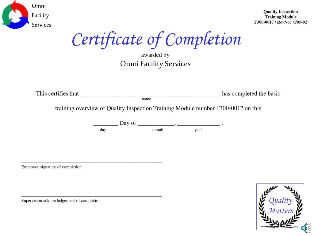 Certificate of Completion awarded by Omni Facility Services This certifies that ______________________________________________ has completed the basic training overview of Quality Inspection Training Module number F300-0017 on this ________ Day of ____________, ______________ . name day month year ______________________________________________ Employee signature of completion ______________________________________________ Quality Matters Supervision acknowledgement of completion