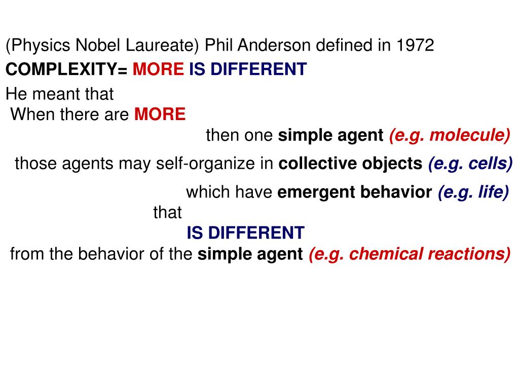 (Physics Nobel Laureate) Phil Anderson defined in 1972 COMPLEXITY=MORE IS DIFFERENT He meant that When there are MOREthen one simple agent(e.g. molecule) those agents may self-organize in collectiveobjects(e.g. cells) which have emergentbehavior (e.g. life) that IS DIFFERENT from the behaviorof the simple agent(e.g. chemical reactions)