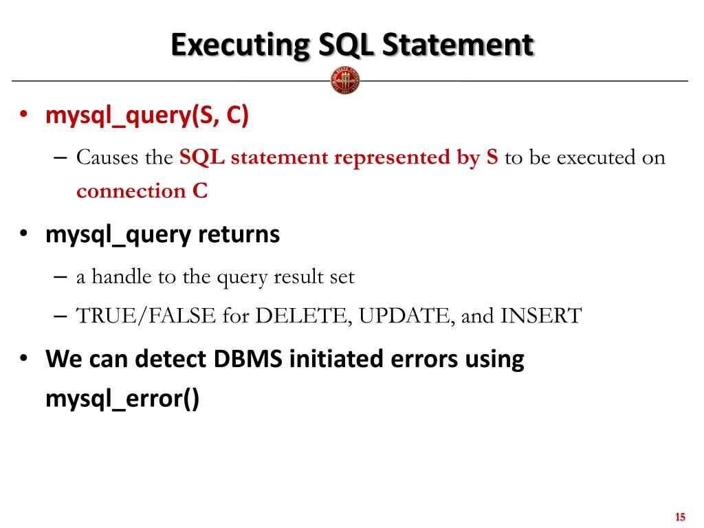 Executing SQL Statement • mysql_query(S, C) • Causes the SQL statement represented by Sto be executed on connection C • mysql_queryreturns • a handle to the query result set • TRUE/FALSE for DELETE, UPDATE, and INSERT • We can detect DBMS initiated errors using mysql_error()