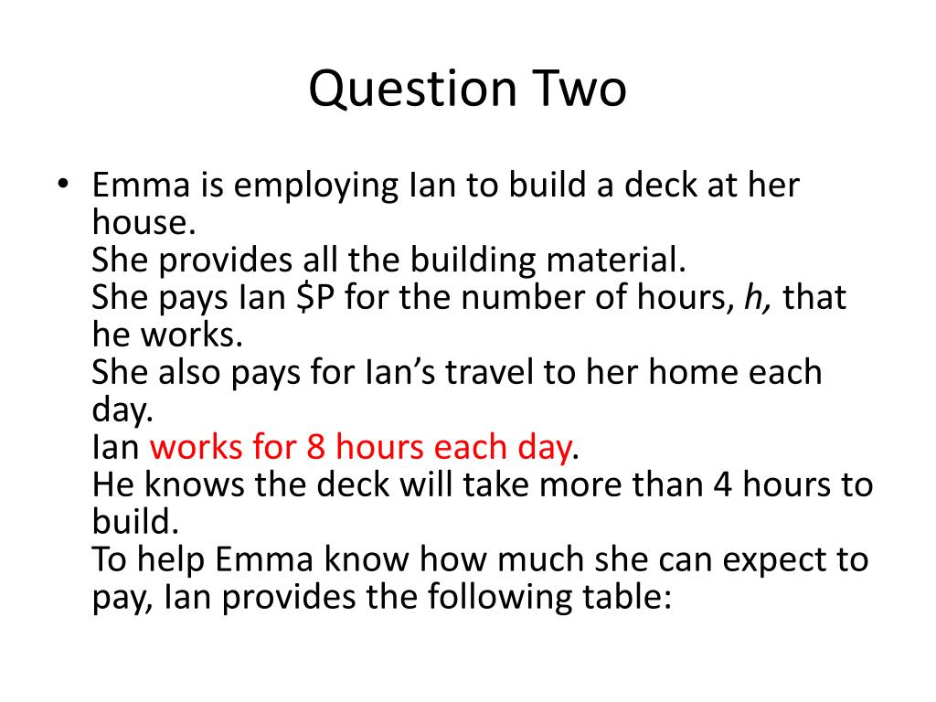 Question Two • Emma is employing Ian to build a deck at her house.She provides all the building material.She pays Ian $P for the number of hours, h, that he works.She also pays for Ian’s travel to her home each day.Ian works for 8 hours each day.He knows the deck will take more than 4 hours to build.To help Emma know how much she can expect to pay, Ian provides the following table: