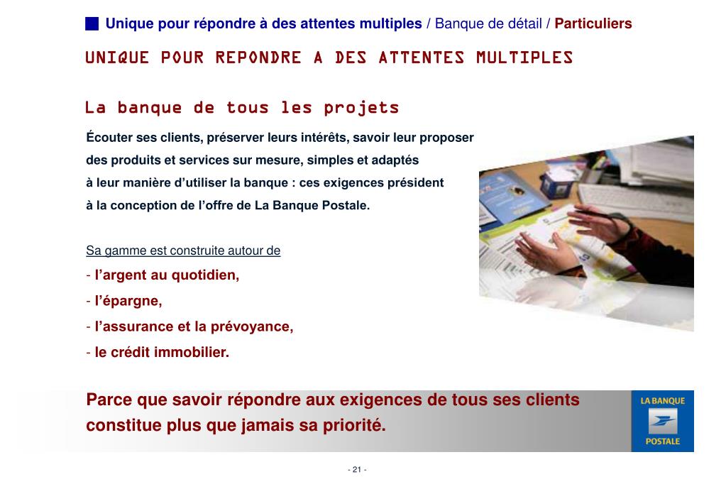 Unique pour répondre à des attentes multiples / Banque de détail / Particuliers UNIQUE POUR REPONDRE A DES ATTENTES MULTIPLES La banque de tous les projets • Écouter ses clients, préserver leurs intérêts, savoir leur proposer des produits et services sur mesure, simples et adaptés à leur manière d’utiliser la banque : ces exigences président à la conception de l’offre de La Banque Postale.Sa gamme est construite autour de • l’argent au quotidien, • l’épargne, • l’assurance et la prévoyance, • le crédit immobilier. • Parce que savoir répondre aux exigences de tous ses clients constitue plus que jamais sa priorité.