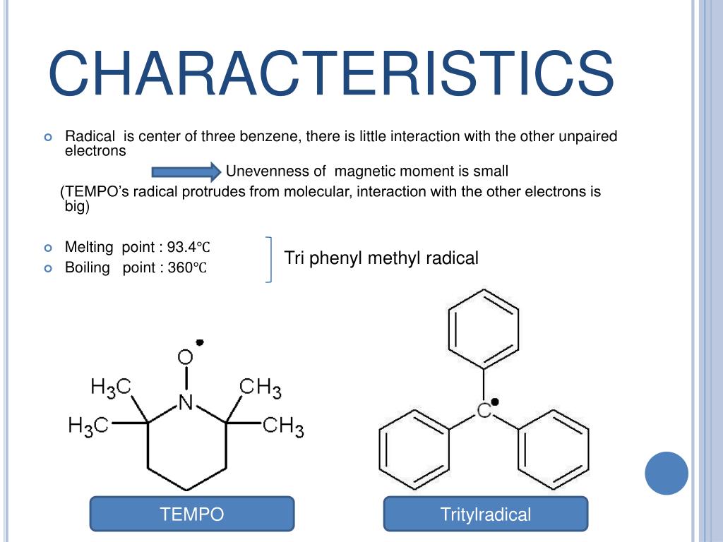 CHARACTERISTICS • Radical is center of three benzene, there is little interaction with the other unpaired electrons Unevenness of magnetic moment is small (TEMPO’s radical protrudes from molecular, interaction with the other electrons is big) • Melting point :93.4℃ • Boiling point : 360℃ Tri phenyl methyl radical TEMPO Tritylradical