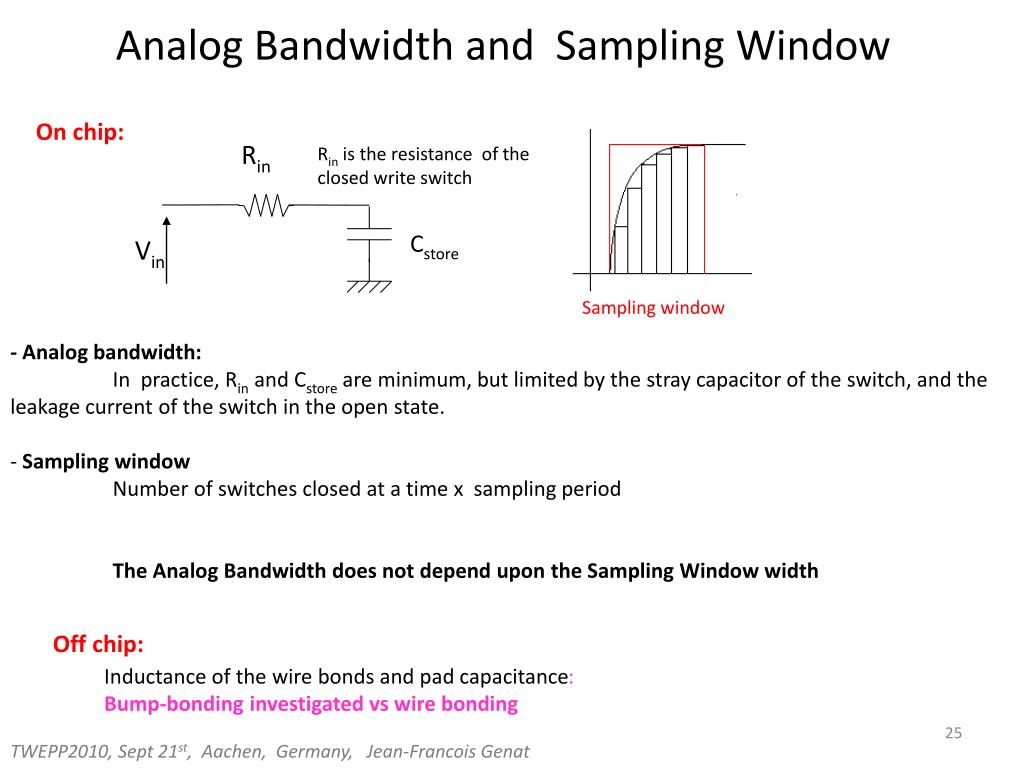 Rin Cstore Vin Analog Bandwidth and Sampling Window On chip: Rin is the resistance of the closed write switch Sampling window • - Analog bandwidth: • In practice, Rinand Cstore are minimum, but limited by the stray capacitor of the switch, and the leakage current of the switch in the open state. • Sampling window • Number of switches closed at a time x sampling period • The Analog Bandwidth does not depend upon the Sampling Window width Off chip: Inductance of the wire bonds and pad capacitance: Bump-bonding investigated vs wire bonding TWEPP2010, Sept 21st, Aachen, Germany, Jean-Francois Genat