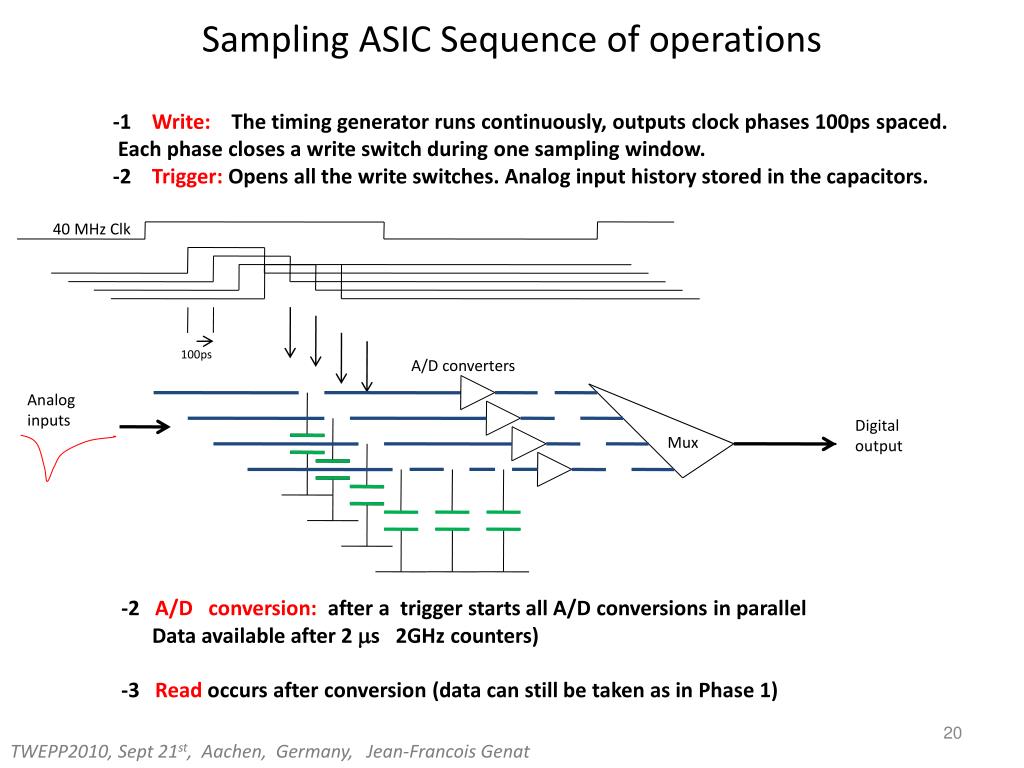 Sampling ASIC Sequence of operations -1 Write: The timing generator runs continuously, outputs clock phases 100ps spaced. Each phase closes a write switch during one sampling window. -2 Trigger: Opens all the write switches. Analog input history stored in the capacitors. 40 MHz Clk 100ps A/D converters Analog inputs Digital output Mux -2 A/D conversion: after a triggerstarts all A/D conversions in parallel Data available after 2 ms 2GHz counters) -3 Read occurs after conversion (data can still be taken as in Phase 1) TWEPP2010, Sept 21st, Aachen, Germany, Jean-Francois Genat