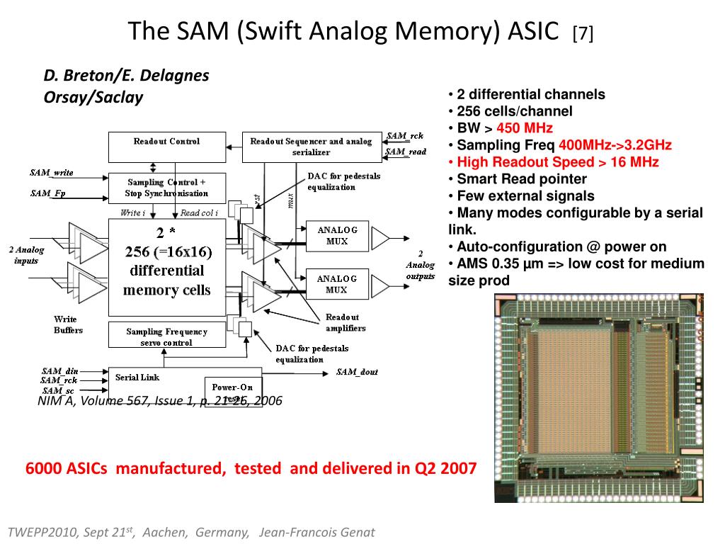 The SAM (Swift Analog Memory) ASIC[7] D. Breton/E. Delagnes Orsay/Saclay • 2 differential channels • 256 cells/channel • BW > 450 MHz • Sampling Freq 400MHz->3.2GHz • High Readout Speed > 16 MHz • Smart Read pointer • Few externalsignals • Many modes configurable by a serial link. • Auto-configuration @ power on • AMS 0.35 µm => lowcost for medium size prod NIM A, Volume 567, Issue 1, p. 21-26, 2006 6000 ASICsmanufactured, tested and deliveredin Q2 2007 TWEPP2010, Sept 21st, Aachen, Germany, Jean-Francois Genat